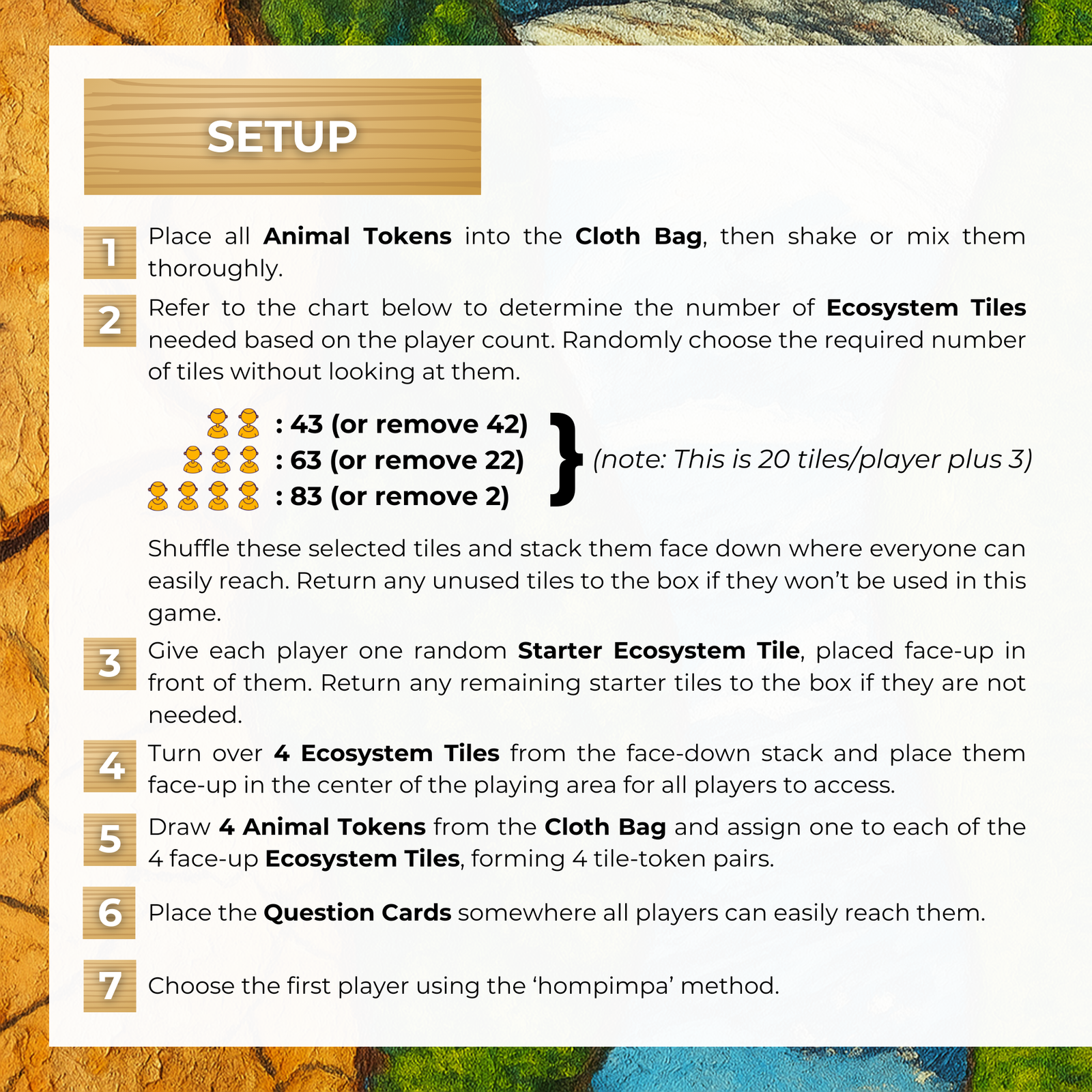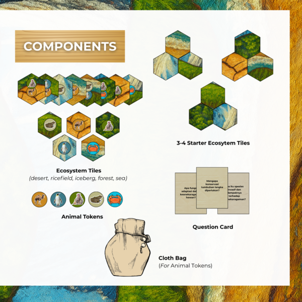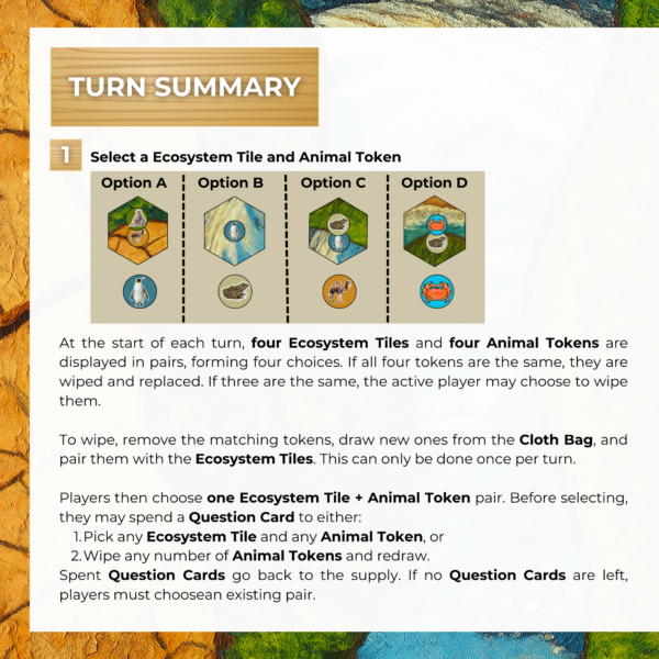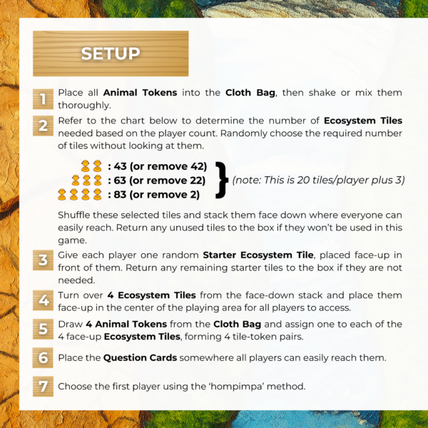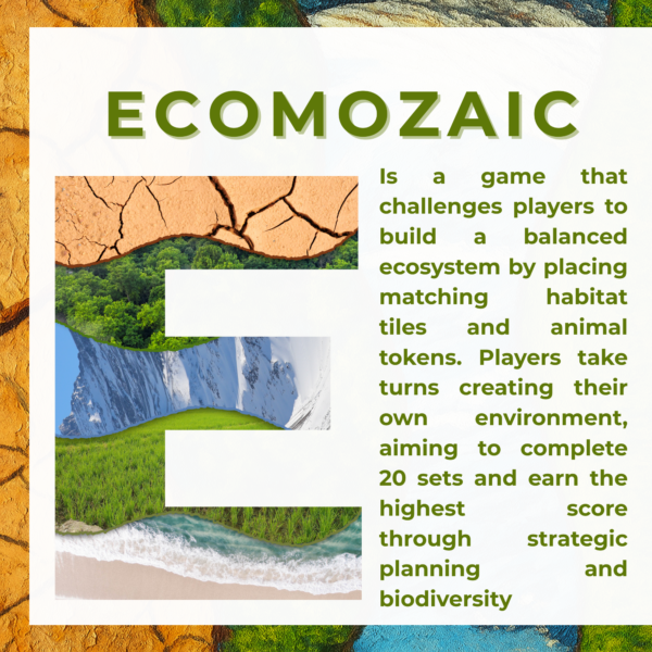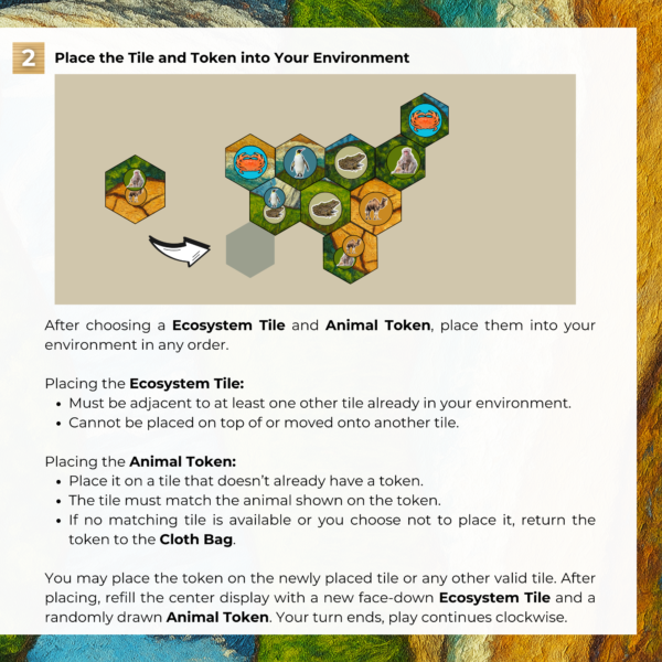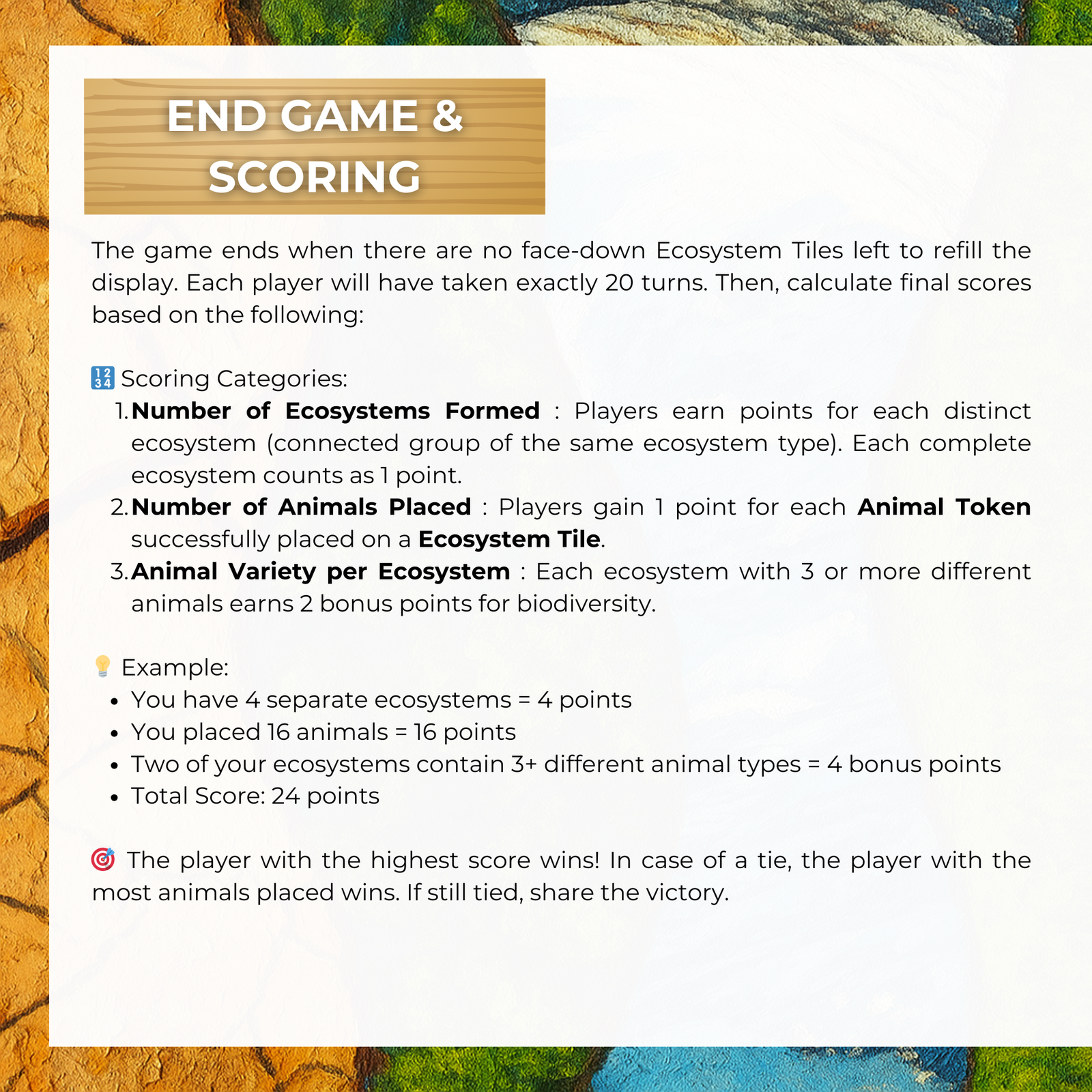 Is a game that challenges players to build a balanced ecosystem by placing matching habitat tiles and animal tokens. Players take turns creating their own environment, aiming to complete 20 sets and earn the highest score through strategic planning and biodiversity.