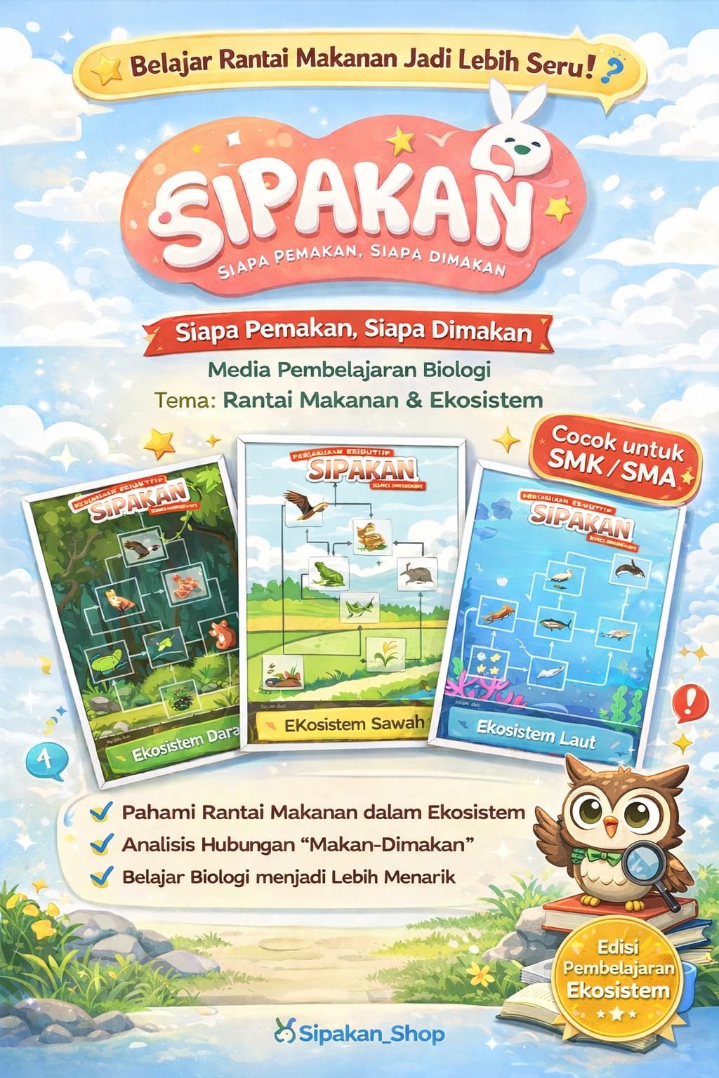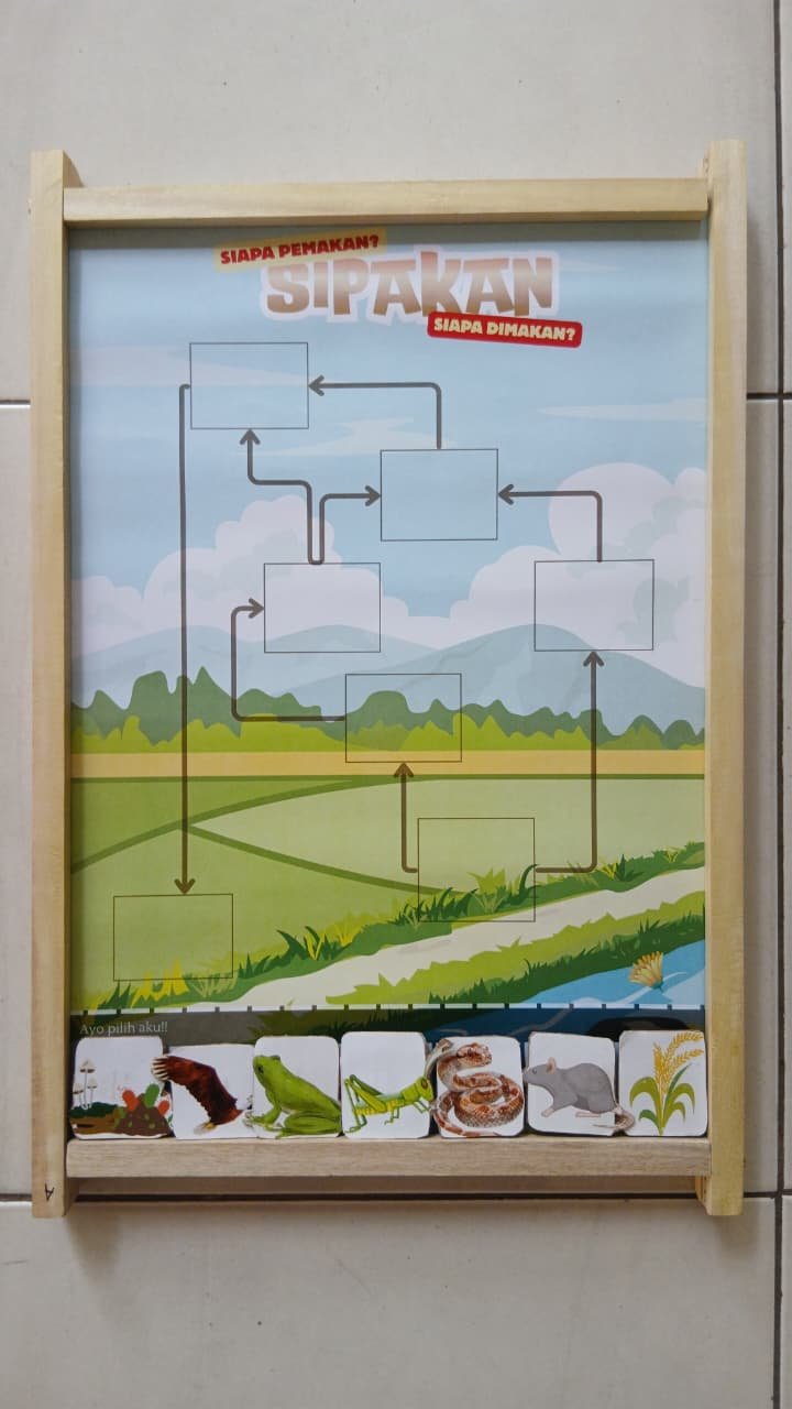 SIPAKAN (Siapa Pemakan, Siapa Dimakan) adalah permainan edukatif yang mengajarkan konsep rantai makanan dan hubungan makan-dimakan dalam ekosistem. Pemain diajak mengenali peran makhluk hidup sebagai pemakan atau yang dimakan melalui aktivitas bermain yang interaktif, menyenangkan, dan mudah dipahami