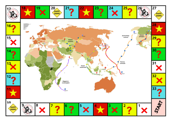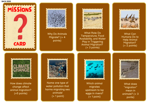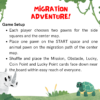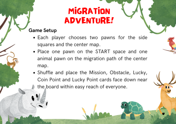 Migration Adventure is an educational board game specifically designed to help students understand the process of animal migration in a fun and interactive way. Through this game, students are invited to explore the world of animals that migrate for survival. In the game, each player represents an animal group and begins the game with unique animals that have different migration characteristics. Here, students compete to achieve goals while learning about animal life cycles, ecological relationships, and migration processes in nature.